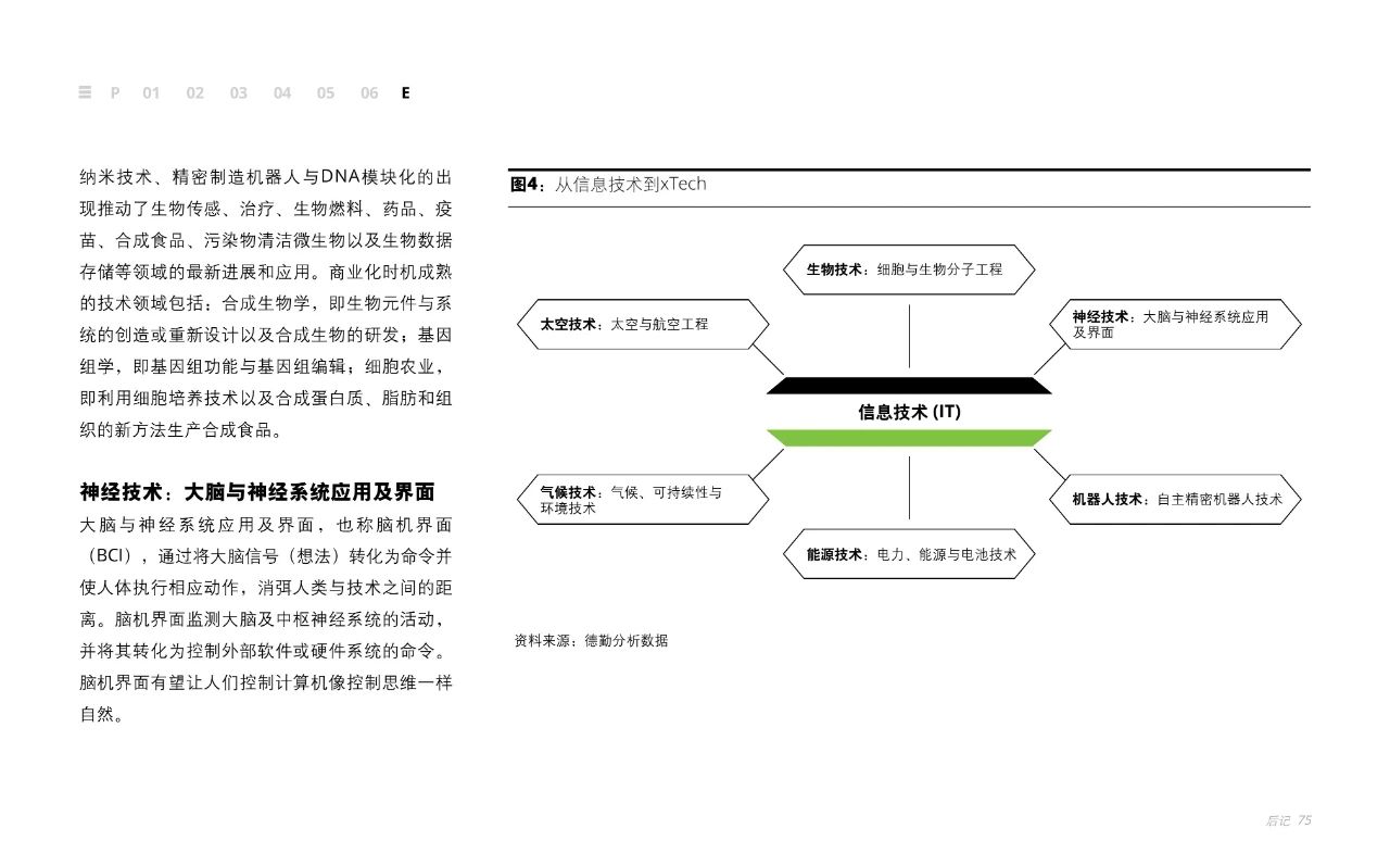 从学科对业务创新的影响力来看,德勤预计最终能与 IT相媲美的有以下六大新兴技术领域:空间与航空工程;细胞与生物分子工程;大脑与神经系统应用及界面;气候、可持续性与环境;自主精密机器人技术;电力、能源与电池技术。