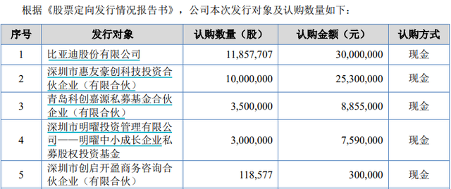 其他机构投资者认购方面,深圳市惠友豪创科技投资合伙企业(有限合伙)出资2530万元,认购了1000万股。青岛科创嘉源私募基金合伙企业(有限合伙)出资了885.50万元,认购了350万股。深圳市明曜投资管理有限公司——明曜中小成长企业私募股权投资基金出资了759万元,认购了300万股。
