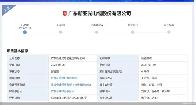 导读:全面注册制下主板首家新受理IPO公司来了!深交所官网显示,广东新亚光电缆股份有限公司(以下简称“新亚电缆”)深市主板IPO于3月29日获得受理,成为存量企业平移工作完成后首家获受理的主板IPO企业。