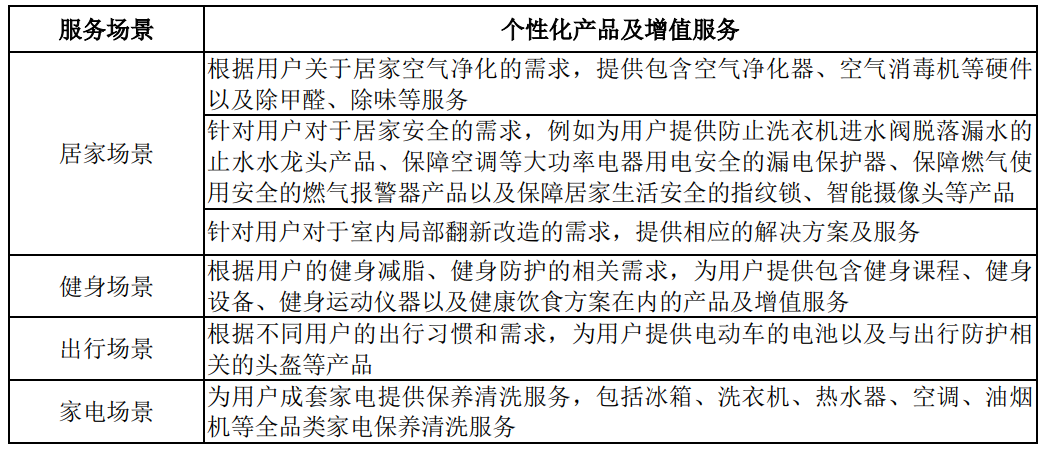 目前,公司围绕家电、居家、健身及出行在内的消费场景,主要提供如下个性化场景解决方案及增值服务: