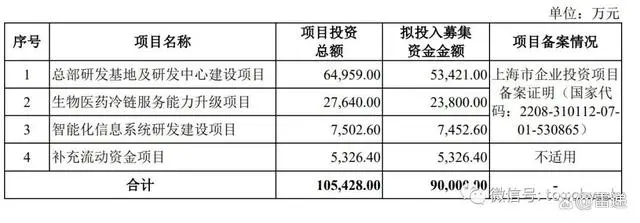 上海生生计划募资9亿元,其中,5.34亿元用于总部研发基地及研发中心建设项目,2.38亿元用于生物医药冷链服务能力升级项目,7452.6万元用于智能化信息系统研发建设项目,5326.4万元用于补充流动资金项目。