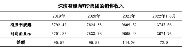 但深演智能在回复深交所第一轮问询中,第4个问题“关于客户”时,却披露2019-2022年1-6月,WPP集团向深演智能采购的金额分别为5701.85万元、7533.76万元、9665.26 万元、3674.76 万元。