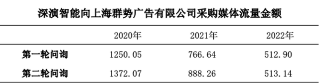 2020-2022年月深演智能向上海群势广告有限公司采购媒体流量金额分别为1她250.05万元、766.64万元、512.90万元。