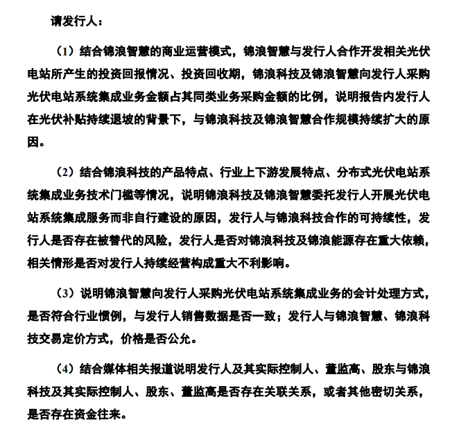 据此,晴天科技被要求说明报告内在光伏补贴持续退坡的背景下,与锦浪科技及锦浪智慧合作规模持续扩大的原因;与锦浪科技合作的可持续性,是否存在被替代的风险;说明锦浪智慧向晴天科技采购光伏电站系统集成业务的会计处理方式,是否符合行业惯例,与晴天科技销售数据是否一致等。