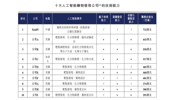 十大人工智能药物发现公司的融资总额及技术能力(数据来源:晶泰科技招股书)