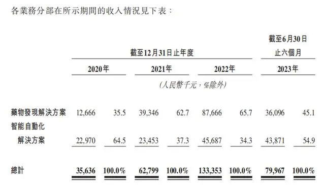 从收入来源看,晶泰科技主要包括药物发现解决方案及智能自动化解决方案。今年1-6月,晶泰科技上述2个业务取得收入分别为3609.6万元和4387.1万元,在营收中的占比分别为45.1%和54.9%。