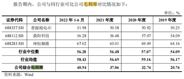 但相较于同业可比公司,思仪科技的综合毛利率却远低于同行。截至2022年6月末,同行可比公司普源精电、鼎阳科技、坤恒顺维的毛利率分别为51.98%、56.28%和67.02%,均高于思仪科技的综合毛利率40.94%。且综合毛利率也低于行业均值17.49个百分点。