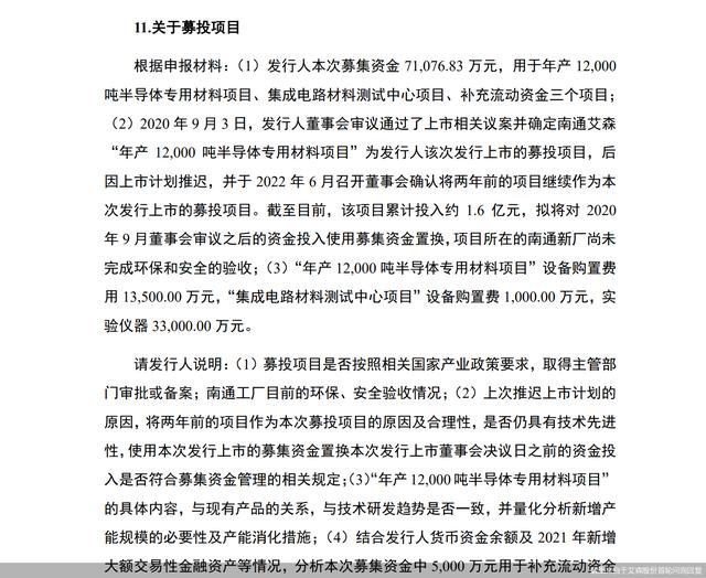 2022年6月,艾森股份再次召开董事会及股东大会,确认将两年前的“年产12000吨半导体专用材料项目”继续作为本次发行上市的募投项目。截至目前,该项目累计投入约1.6亿元,拟将对2020年9月董事会审议之后的资金投入使用募集资金置换。