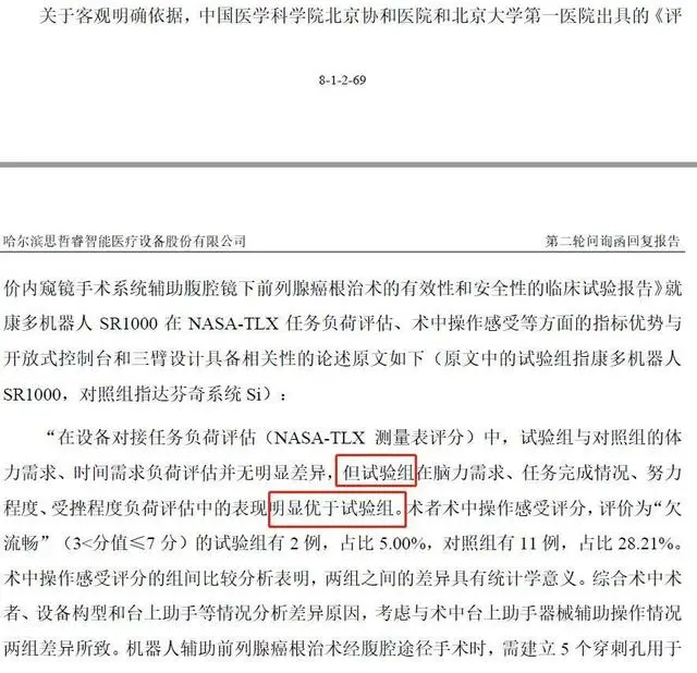 说到这里,首次申报招股书中及第二轮问询回复中的几处信息披露错误,也能反映出发行人与保荐机构为了证明技术水平挖空心思,反而适得其反。一是有故意误导之嫌,思哲睿在招股中多次提到“康多机器人是首个在单家医院辅助开展腔镜手术达到100台的国产腔镜手术机器人”,实际上这100台手术是为了注册临床试验,并不是真正意义上的手术。经上交所问询后思哲睿已修改招股书中所有相关描述,增加了“临床试验手术”的备注。二是描述竟然出现乌龙,为了证明康多机器人在NASA-TLX任务负荷评估、术中操作感受等方面的指标优于达芬奇系统,思哲睿在回复问询中引用了中国医学科学院北京协和医院、北京大学第一医院出具的《评价内窥镜手术系统辅助腹腔镜下前列腺癌根治术的有效性和安全性的临床试验报告》,但原文开头就出现关键错误,截图如下: