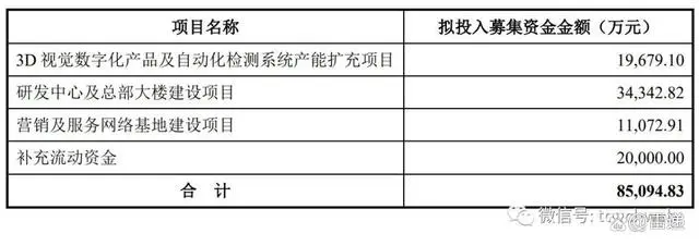 其中,1.97亿元用于3D视觉数字化产品及自动化检测系统产能扩充项目,3.43亿元用于研发中心及总部大楼建设项目,1.1亿元用于营销及服务网络基地建设项目,2亿元用于补充流动资金。