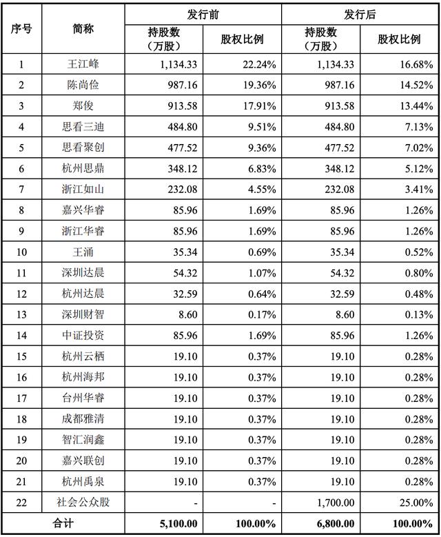 IPO前,王江峰持股22.24%,陈尚俭持股19.36%,郑俊持股17.91%,思看三迪持股9.51%,思看聚创持股9.36%,杭州思鼎持股6.83%,浙江如山持股4.55%,嘉兴华睿、浙江华睿、中证投资均分别持股1.69%,深圳达晨持股1.07%;