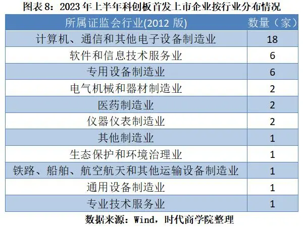 从行业分布来看,2023年上半年科创板首发上市的41家企业中,计算机、通信和其他电子设备制造业有18家,占比为43.9%,位居首位;软件和信息技术服务业和专用设备制造业各有6家,并列第二位;电气机械和器材制造业、医药制造业、仪器仪表制造业各有2家;其他制造业,生态保护和环境治理业,铁路、船舶、航空航天和其他运输设备制造业,通用设备制造业,专业技术服务业各有1家。