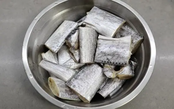 1、将鱼鳞腹部的黑膜彻底去除干净,用流动的清水将鱼腹中的血洗净。切掉带鱼的鱼头和细尾,这两处几乎没有什么肉,可以直接扔掉不要。