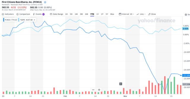 截至3月24日周五,今年以来第一公民银行的股价下跌约23%。