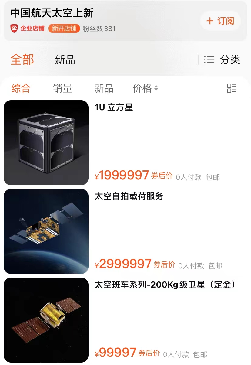 3月30日,“中国航天太空上新”淘宝店上架了3款航天卫星,1U立方星价格约200万元、太空自拍载荷服务约300万、太空班车系列-200Kg级卫星的定金约10万,消费者均可直接下单购买。