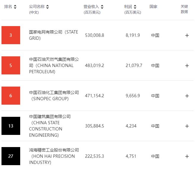 具体来看,中国营业收入前十的企业分别是5300.09亿美元的国家电网、4830.19亿美元的中国石油、4711.54亿美元的中国石化、3058.85亿美元的中国建筑、2225.35亿美元的鸿海精密、2147.66亿美元的工商银行、2027.53亿美元的建设银行、1870.61亿美元的农业银行、1815.66亿美元的中国平安、1738.34亿美元的中国中化。