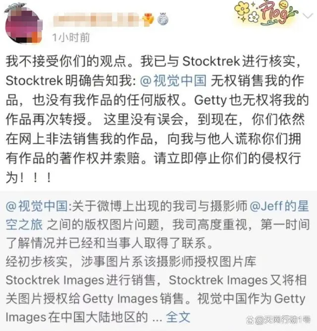 记者针对此事进行了调查,与Stocktrek公司进行了电话交流。据对方透露,仅一个小时前,视觉中国代表已致电该公司,要求从其网站上删除所有涉及戴建峰的作品。Stocktrek公司明确接受了要求,并表示将立即采取相关措施。