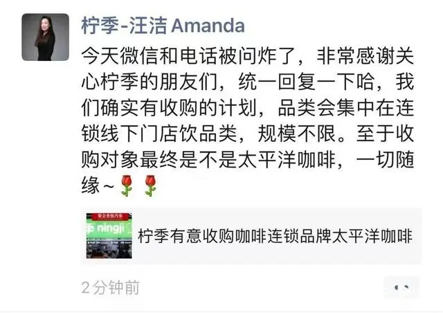 对此,8月21日晚,华润创业新闻发言人回应南都湾财社记者称,不评论市场传闻。而在8月21日傍晚,南都湾财社记者获悉,柠季创始合伙人汪洁在微信朋友圈曾对此事作出回应称,“我们确实有收购计划,品类会集中在连锁线下门店饮品类,规模不限。至于收购对象最终是不是太平洋咖啡,一切随缘。”