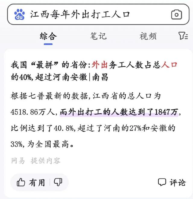 被称之为务工大省的河南,才有27%的人口外出打工,安徽也只有33%,均远低于江西。