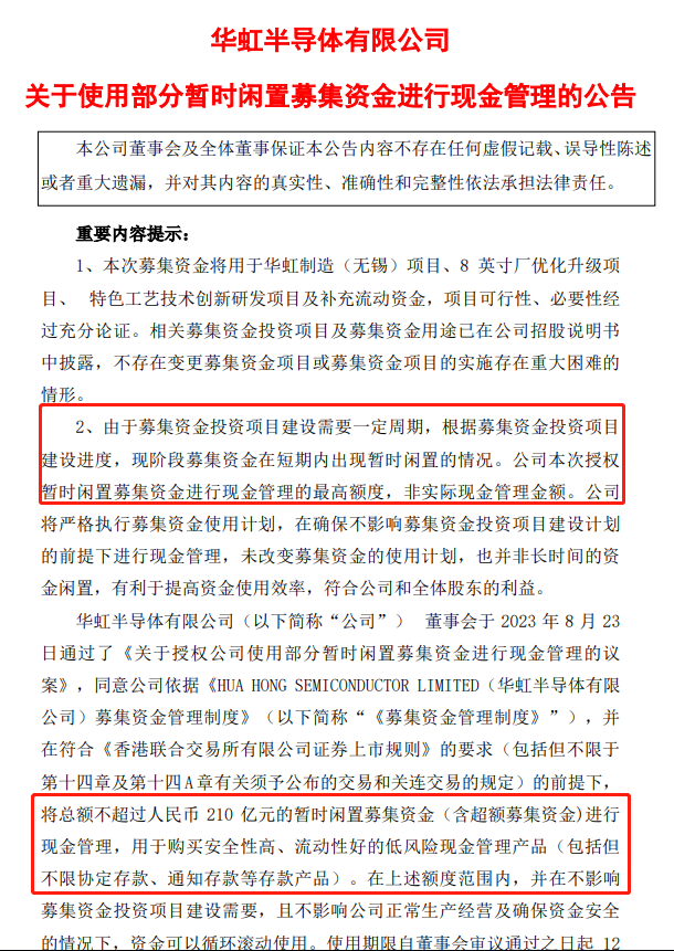 8月23日晚间,华虹公司发布公告称,计划使用最高余额不超过人民币210亿元(含本数)的闲置募集资金进行现金管理,公司将按照相关规定严格控制风险,使用部分闲置募集资金购买安全性高、流动性好的低风险现金管理产品(包括但不限协定存款、通知存款等存款产品),且该等现金管理产品不得用于质押,不用于以证券投资为目的的投资行为。