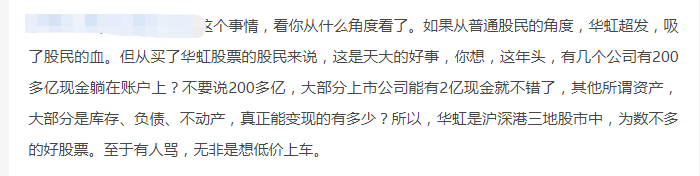 不过,也有网友表示,“资产管理就必须这么做,不能让收益白白浪费”“不要说200亿元,大部分上市公司能有2亿元现金就不错了,对买了华虹公司股票的股民来讲是好事”等。