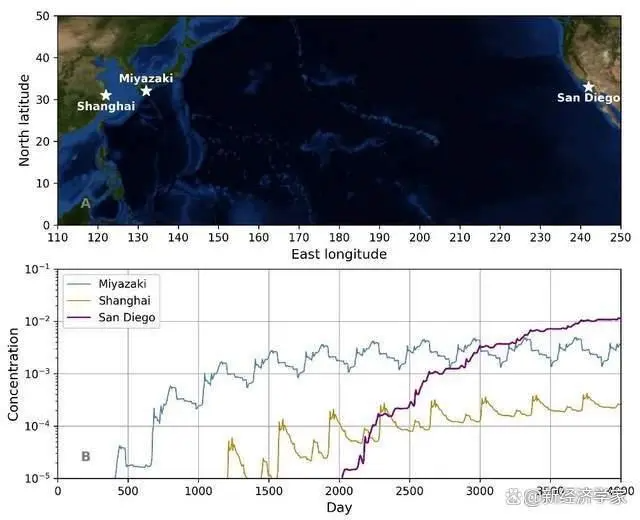 出现这一现象的原因是日本附近强烈的洋流作用——具体来说,福岛处于日本暖流(向北)和千岛寒流(向南)交汇的地方,所以大部分污染物不会沿着陆地边缘向南北方向迁移,而是随着北太平洋暖流向东扩散。这一结果也意味着,在核废水排放的早期,应主要考虑它对亚洲沿岸的影响,但在后期,由于北美沿岸海域的污染物浓度将持续高于大部分东亚沿岸海域,需要重点关注北美沿岸海域的受影响情况。
