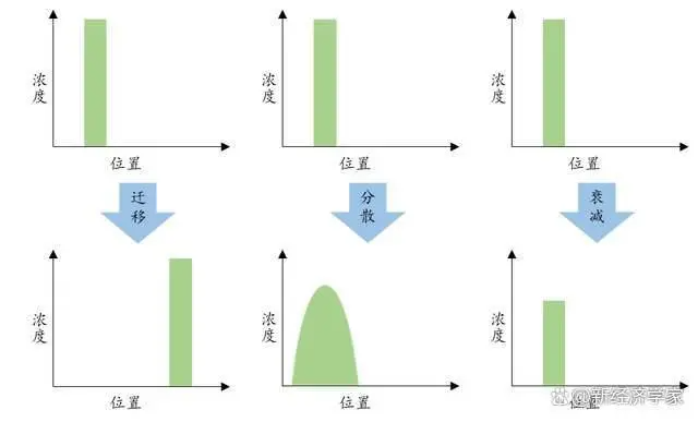 为了实现模拟,研究团队首先将放射性物质在海洋中的扩散拆解为3个近似独立的子过程,分别是迁移过程、分散过程以及衰减过程。简单的说,迁移过程是指污染物随洋流的运动,分散过程是指污染物从高浓度区向低浓度区的输送,衰减过程是指污染物由于自身的分解、衰变等转化为其它物质的过程。下面这张图形象的表示了这3个过程所引起的污染物浓度变化。