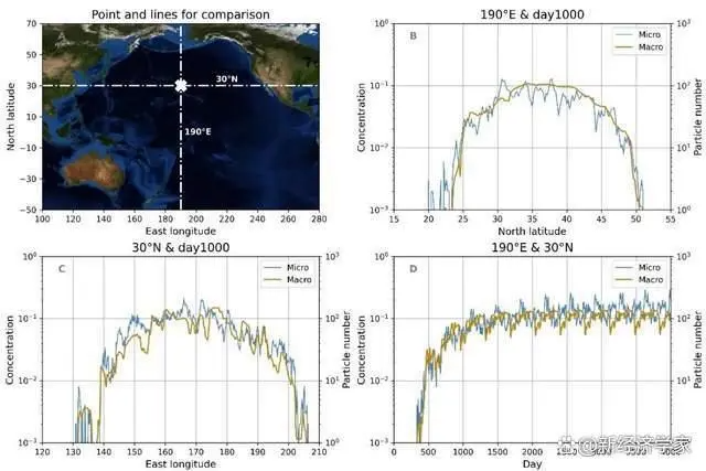 进一步,可以将整个海域划分成一系列方形小区域,然后计算一个时间步长内每个区域的污染物浓度变化(3个子过程叠加),这一计算过程不断迭代进行,就得到了指定时刻的污染物浓度分布。为了补充和验证前面的宏观扩散模拟方法,研究团队还从微观的角度(将污染物分解成大量的独立微粒)进行了核废水排放的扩散模拟,结果如下。