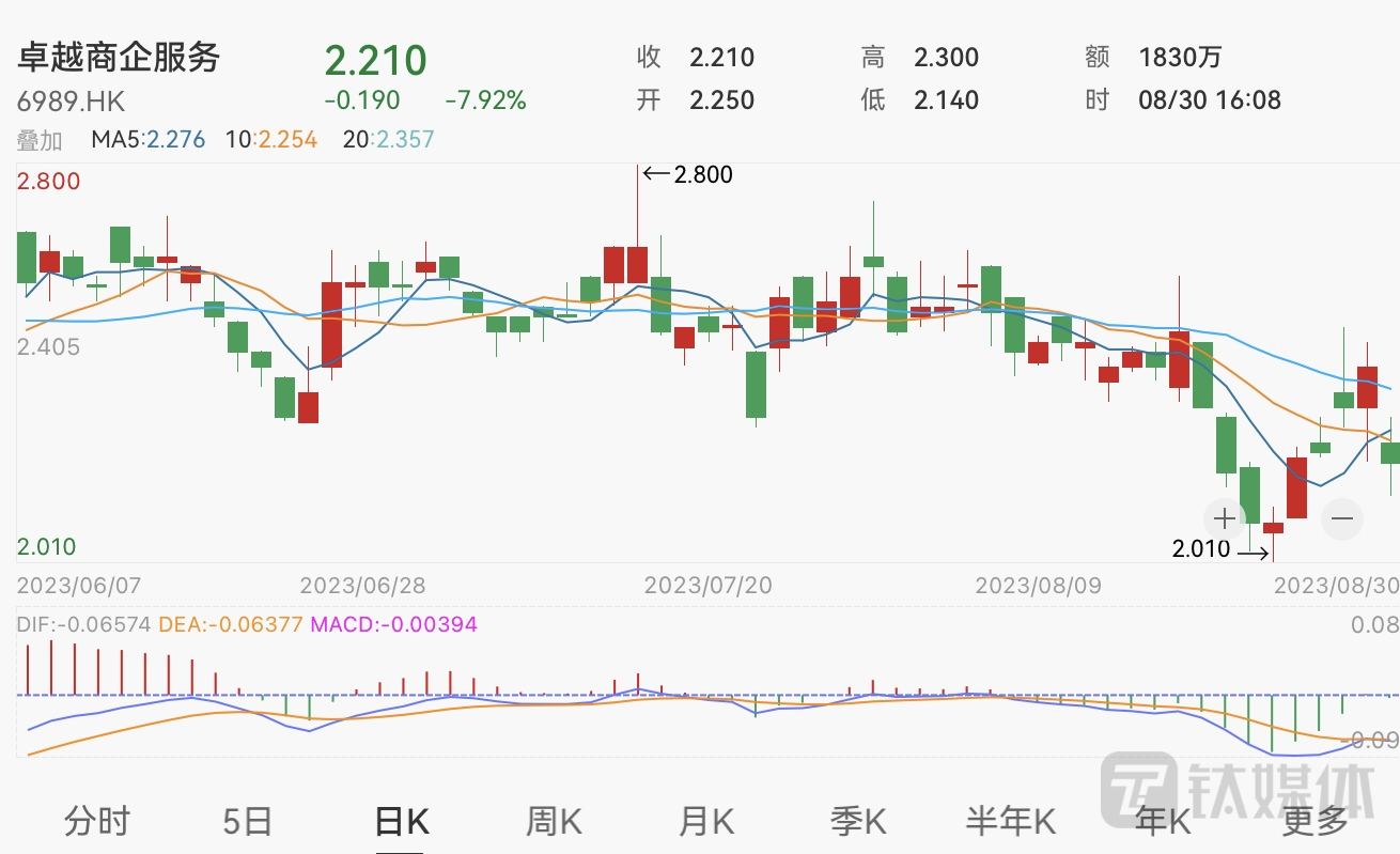 最后再看二级市场方面,截至8月30日港股收盘,卓越商企服务股价报收2.21港元,跌7.92%,当前公司总市值约26.97亿港元。