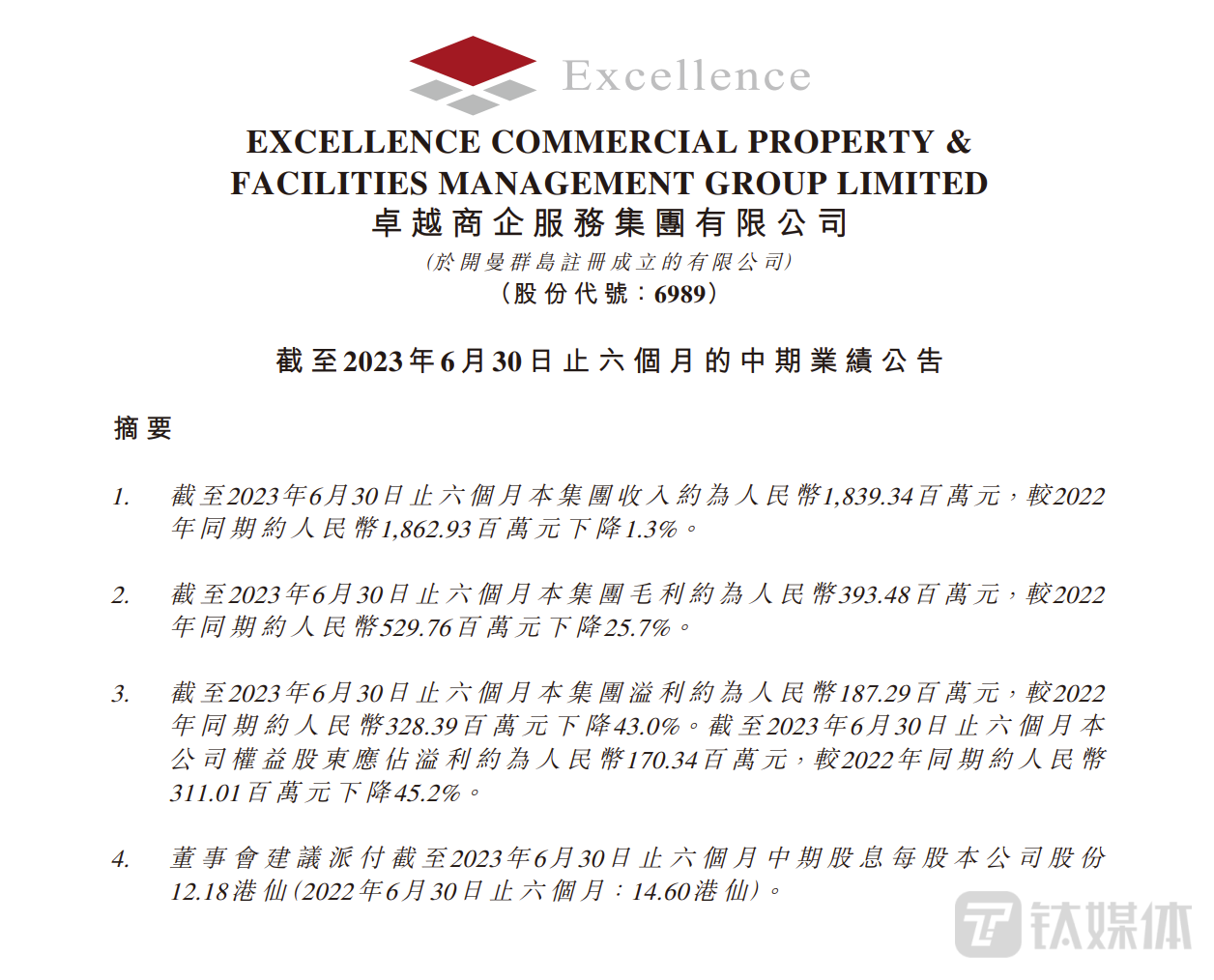 值得注意的是,卓越商企服务延续了以往高派息的传统,报告期内,董事会建议派息每股12.18港仙,派息率达80%。