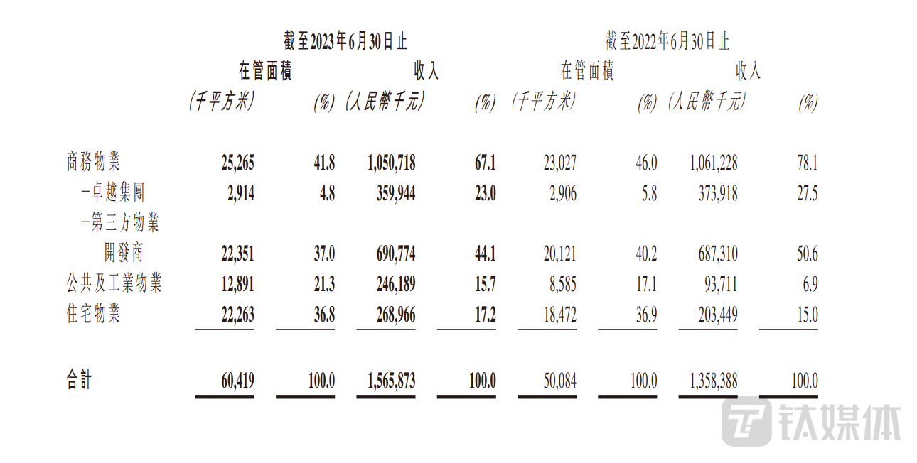 钛媒体APP注意到,今年上半年,卓越商企服务持续发挥在商务物业领域的核心竞争优势,聚焦和深耕商务物业赛道,并在第三方业务拓展方面持续发力,保持了业务的增长韧性。报告期内,公司商务物业的在管面积约2527万平方米,占总在管物业面积的比率为42%。