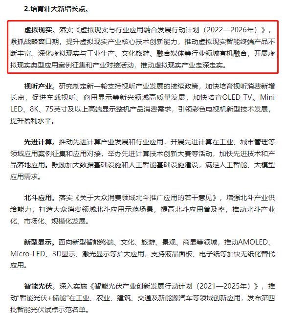 哪些被视作行业未来的新方向?《方案》提出坚定实施扩大内需战略,激发市场潜力,并列出六个新增长点,虚拟现实被提到首位,视听产业、先进计算、北斗应用、新型显示、智能光伏也在其中。