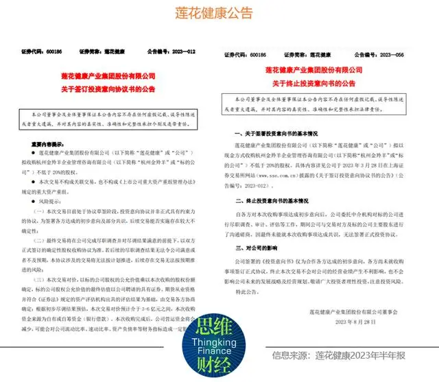 半年报公告发布3天前,8月27日晚间,莲花健康发布公告显示,公司终止收购杭州金羚羊企业管理咨询有限公司(以下简称“杭州金羚羊”)不低于20%的股权。
