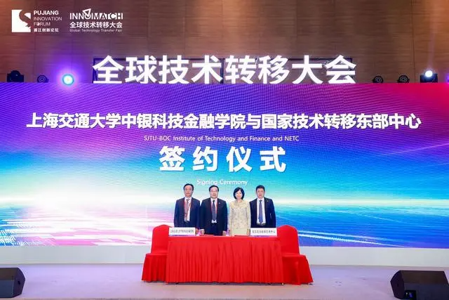 上海交通大学中银科技金融学院与国家技术转移东部中心在会上举行了签约仪式。上海交通大学党委常委、副校长奚立峰在演讲中表示,2020年以来,成果转让、许可、作价投资合同总额超30亿元,2022年技术开发、咨询、服务等产学研合同额达到22.2亿元。
