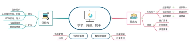 狭义来讲:短视频行业的中游就是以字节、腾讯、快手为首的技术平台提供方,作为桥梁连接供需双方。