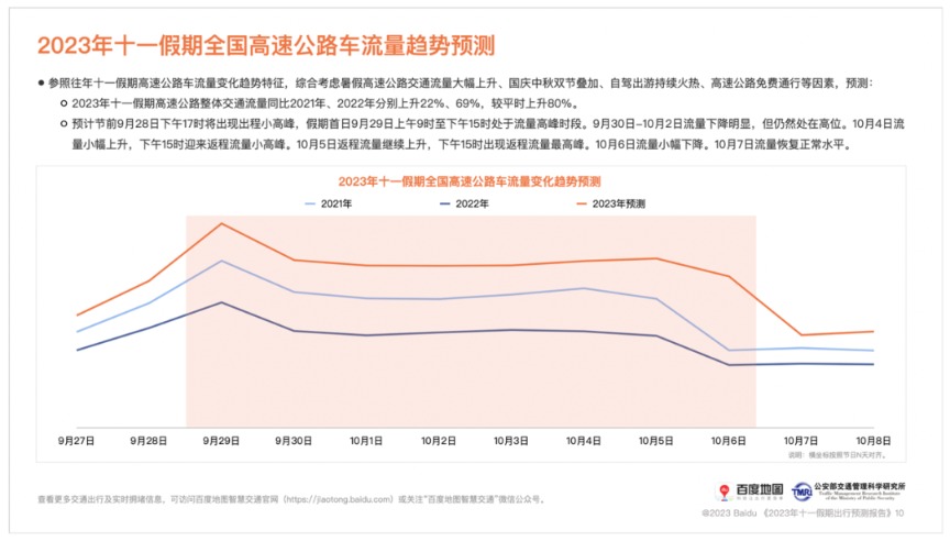全国高速公路流量压力相应上升。考虑到假期延长、全国高速公路免通行费等因素,报告预测,2023年十一假期高速公路整体交通流量将较平时大幅上扬80%,同比2021年、2022年分别上升22%、69%。