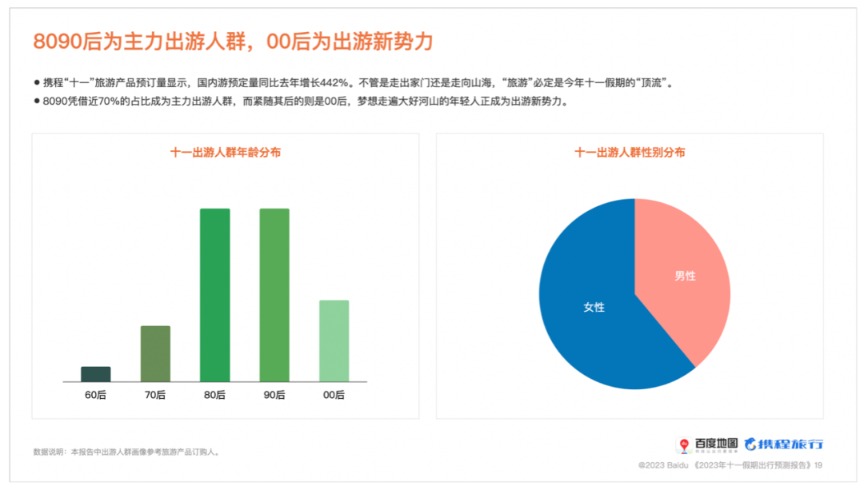 出游人群年龄方面,80后、90后群体依然是出游主力,但第一批“迈入社会”的00后占比已超过70后,成为小长假出游预订的新生力量。