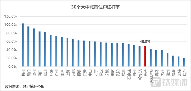 根据公开数据,采用住户贷款余额与名义GDP之比的算法,对30个大中城市的住户杠杆率进行了测算。结果显示,住户杠杆率最高的城市是杭州,长沙以48.9%的住户杠杆率排名第23,比杭州低54.3%,低于全国平均住户部门杠杆率11.5个百分点。