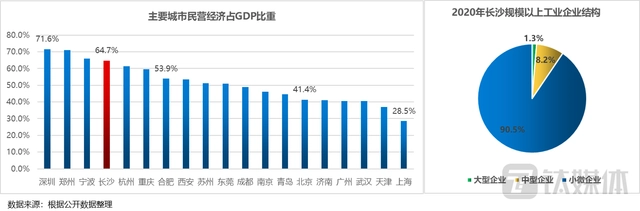 2021年,长沙GDP超过1.3万亿,民营经济增加值8579.89亿,贡献了64.7%的GDP, 58%以上的税,50%以上的高新技术产值,满足了65%以上的“四上”企业就业人员就业。民营经济占比超过杭州等地,位居全国第4位。