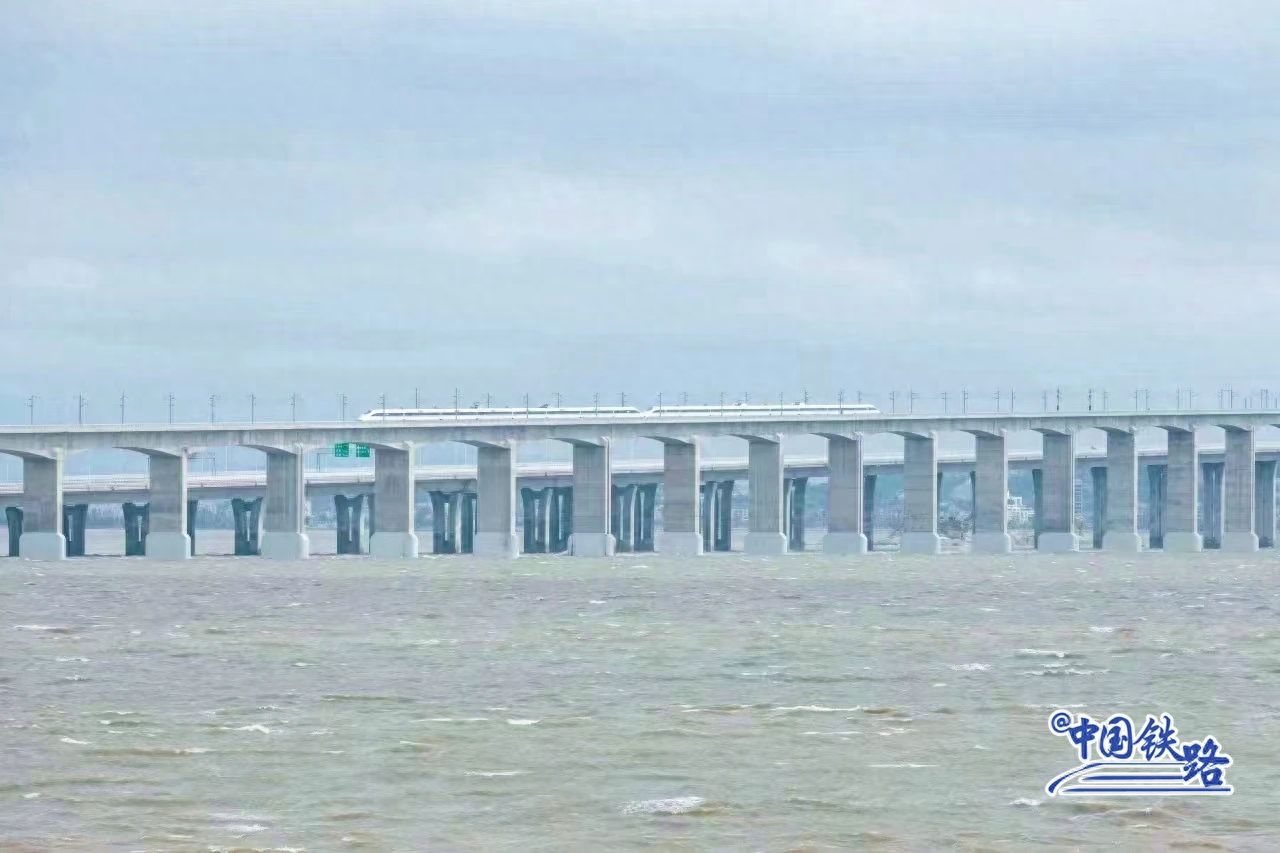 福厦高铁是我国首条跨海高铁,全线有三座大型跨海大桥,先后跨越湄洲湾、泉州湾、安海湾三个海湾。其中,安海湾特大桥首次在跨海斜拉桥上铺设无砟轨道,时速350公里高铁列车可不减速跨海过桥,驶过650米主桥用时不到7秒。