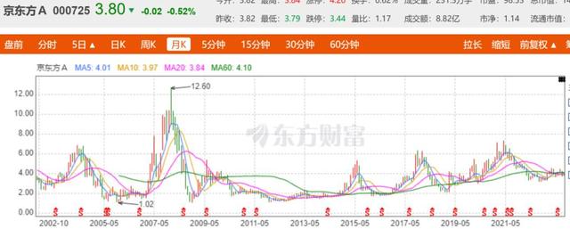 截至9月27日收盘,京东方股价为3.80元,距其12.6元的股价高点,已经跌去70%,市值蒸发3358亿元。