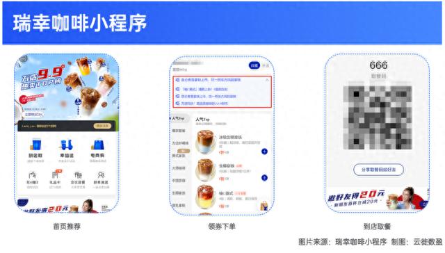 点单有自己的小程序、APP;制作有定制化的咖啡机,店员只需要手动配比;零售与营销同样可以配置大数据自动推送优惠,通过小程序、APP、第三方外卖平台等窗口触达消费者。