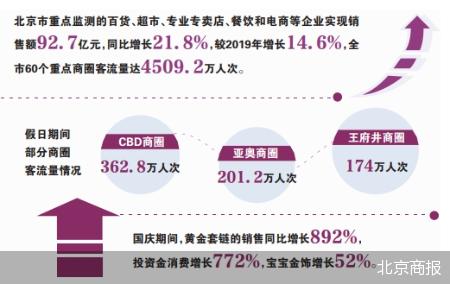 导读:当中秋遇上国庆,假日时间延长带来了消费的加速升温。近日,北京市商务局数据显示,假日期间,北京市重点监测的百货、超市、专业专卖店、餐饮和电商等企业实现销售额92.7亿元,同比增长21.8%,较2019年增长14.6%,全市60个重点商圈客流量达4509.2万人次。