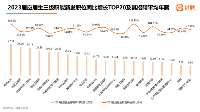 猎聘大数据研究院的《2023届高校毕业生就业数据报告》显示,在2023届应届生投递人数增长最多的TOP10赛道中,AIGC、AI大模型分别位列第二、第三,同比增长297.27%、235.25%。