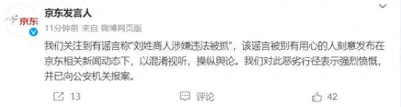 导读:京东13日在官微表示,公司关注到有谣言称“刘姓商人涉嫌违法被抓”,该谣言被别有用心的人刻意发布在京东相关新闻动态下,以混淆视听、操纵舆论。公司对此恶劣行径表示强烈愤慨,并已向公安机关报案。