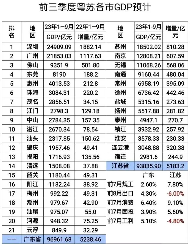 这也让大家对其前前三季度的预测很有信心,从下辖21市来看,是全部呈现出正增长预测,最终预测的GDP也是达到了96961.68亿元,再次位列全国第一,具体来看下辖21市GDP预测情况。