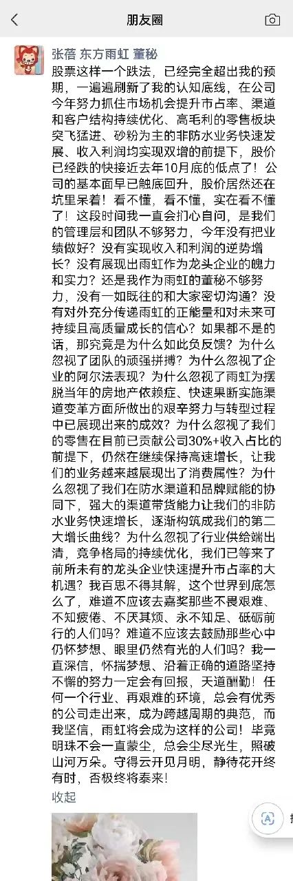不过近日,一张东方雨虹董秘张蓓在社交媒体发言的截图在网络上流传。有知情人士告诉《证券日报》记者,该言论内容应该来自张蓓。