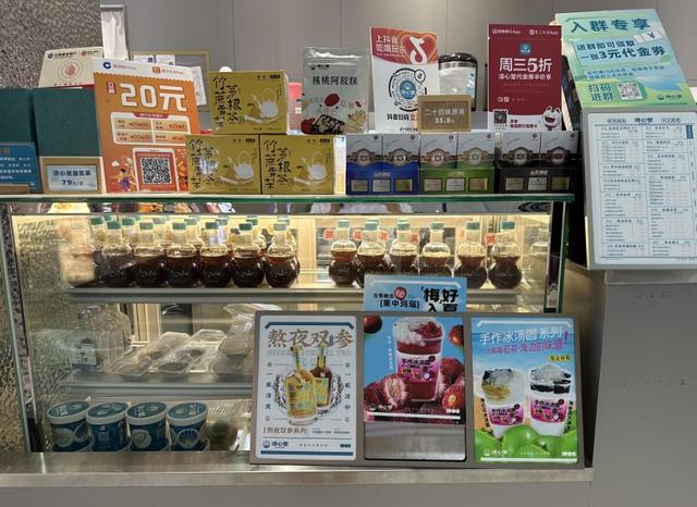 该店面积虽然不大,但整体的SKU比较丰富。饮品方面,除了凉茶系列饮品,菜单上还有草本咖啡元气系列、桃胶甜品系列、姨妈热饮暖身系列、草本柠茶系列等养生茶饮,总SKU近50个,定价在10-28元不等。