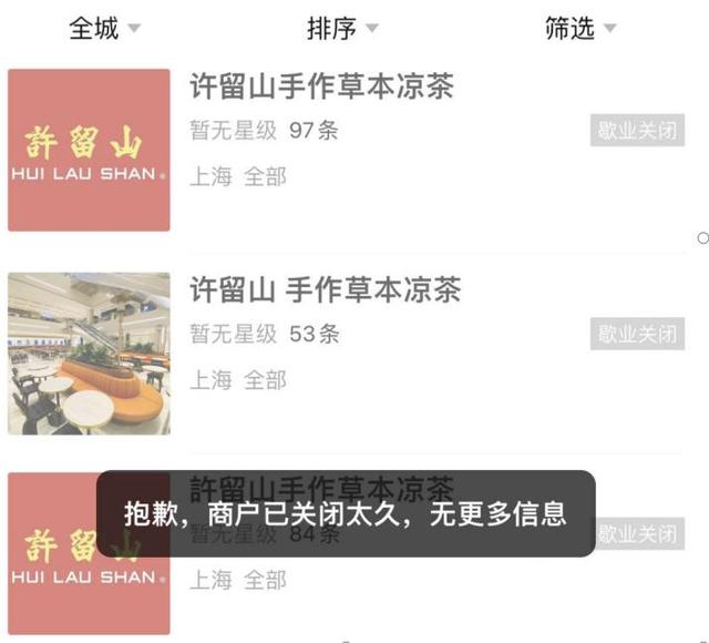 许留山旗下手作草本凉茶品牌,顶峰时期也仅有4家门店,且不知在何时已经关停。