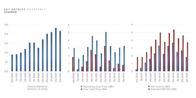 受到连续的降价影响,特斯拉的单车收入下降了1万人民币左右,这也使得收入增幅明显小于销量增幅。三季度总收入为234亿美元,其中,总汽车业务营收为196.25亿美元,同比仅增长5%。